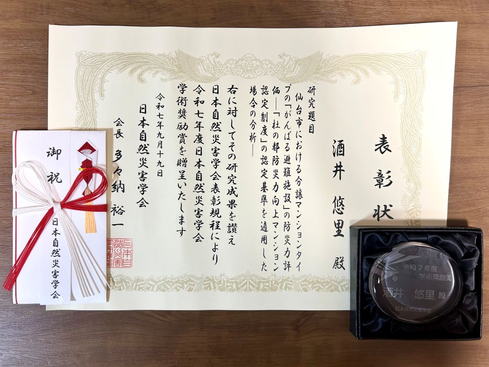 酒井悠里さん(佐藤研D2)が発表した論文「仙台市における分譲マンションタイプの「がんばる避難施設」の防災力評価-「杜の都防災力向上マンション認定制度」の認定基準を適用した場合の分析-」が、令和7年度日本自然災害学会学術奨励賞を受賞しました。 -