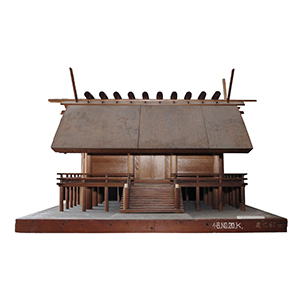 皇大神宮(内宮)と豊受大神宮(外宮)のうち、前者の中心的な建物。切妻造、掘立柱、高床式、妻入、棟持柱など神明造の特徴にくわえ、登高欄が付く十段の階(きざはし)、十本の鰹木、内削ぎの千木、茅葺屋根、金属製の擬宝珠など、実在の建造物にみる技法・意匠が忠実に表現されている。その一方で、銅製居玉や飾金具がないなどの相違点も確認できる。(山崎有生)