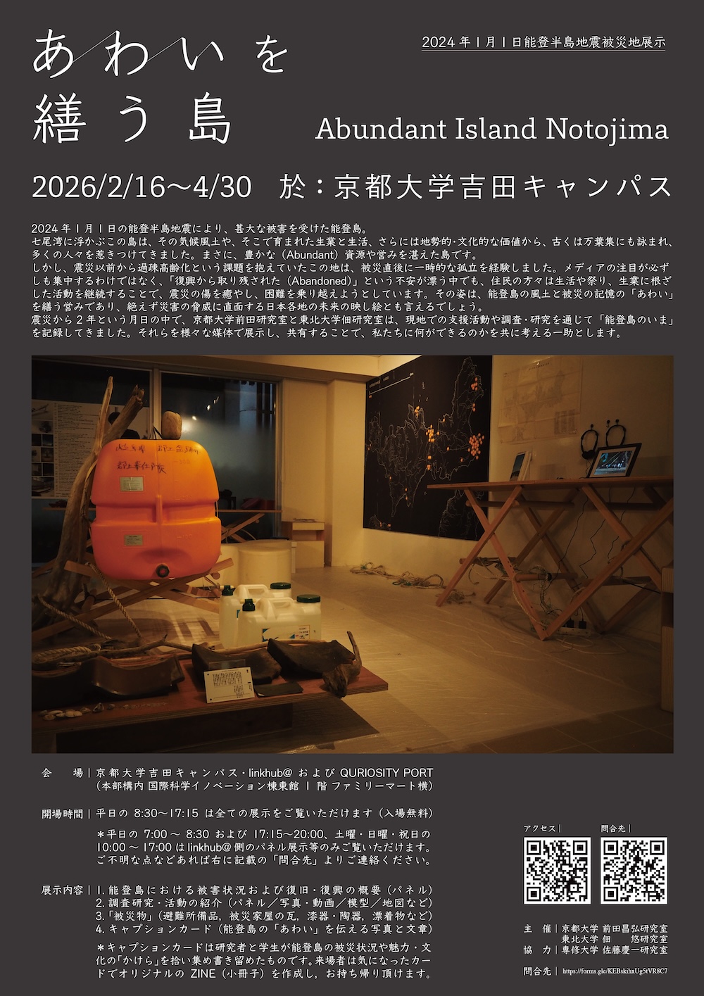 2024年能登半島地震の発生後から2年間、佃研究室が七尾市能登島で継続してきた支援活動や調査の内容を報告する展示「あわいを繕う島 Abundant Island Notojima」を京都大学で開催中です。